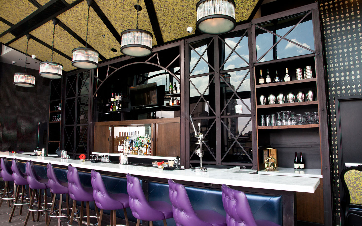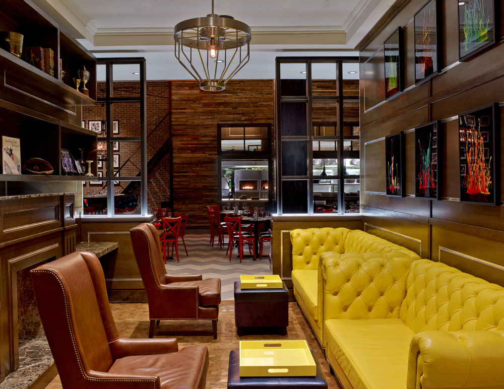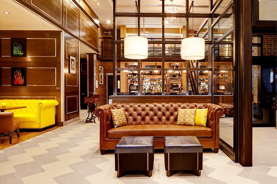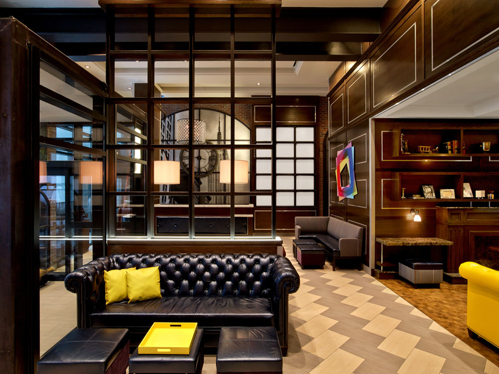 Rising 22 stories, Archer New York evokes industrial elegance through its chesterfield-style sofas, vibrant art and exposed brick walls. You’ll find Tiger Leather throughout the common spaces in shades of dark and metallic blue, vibrant yellow, electric purple and conventional brown.