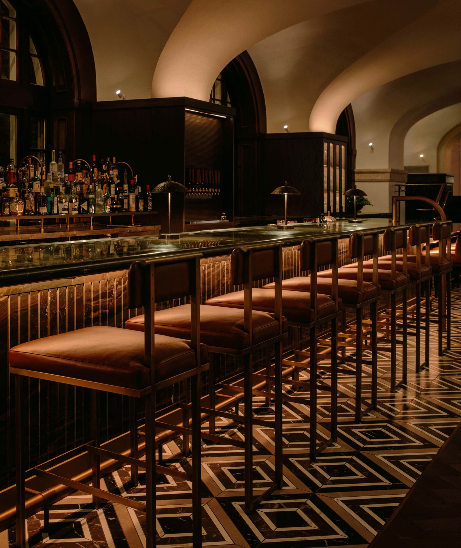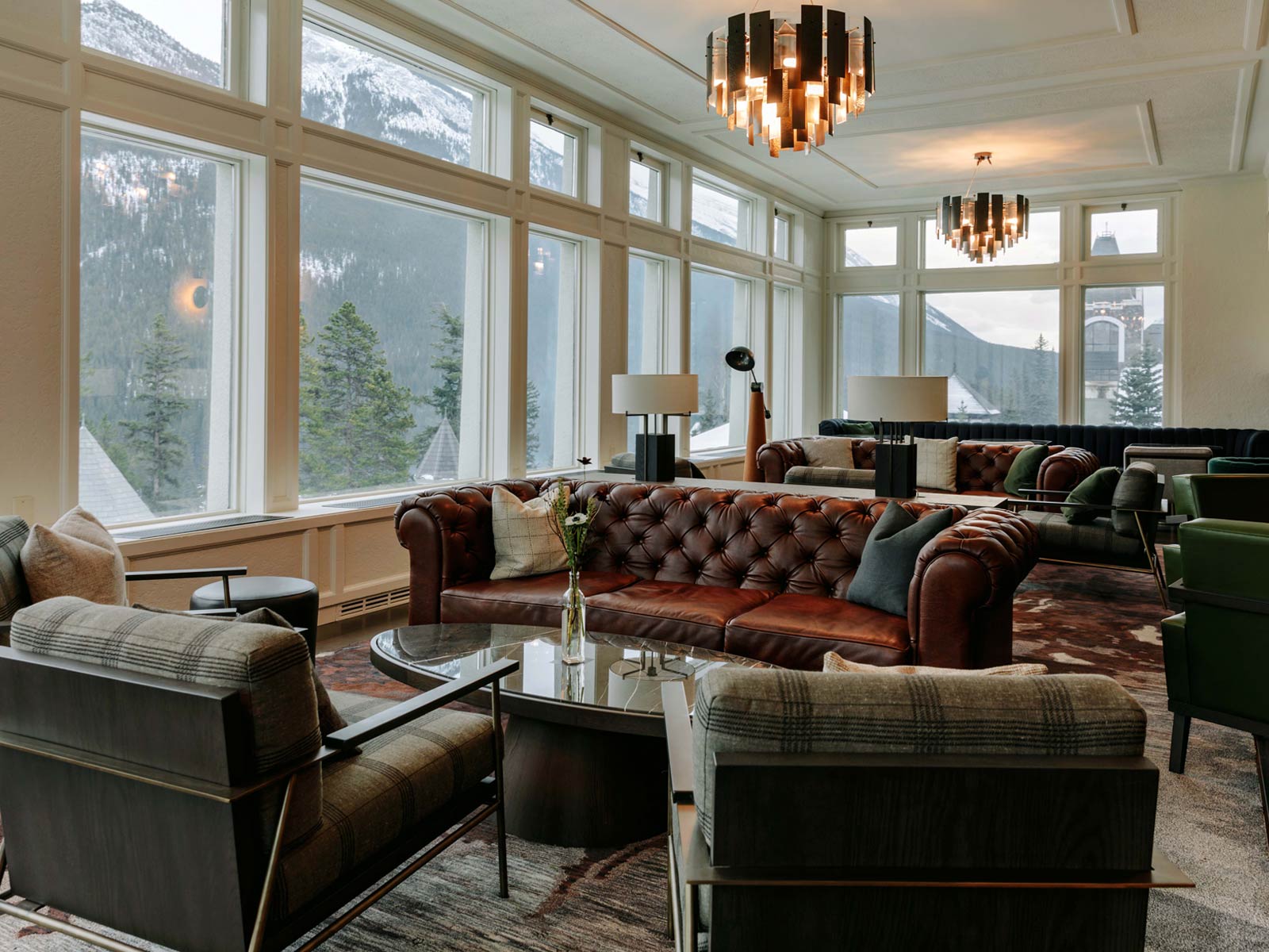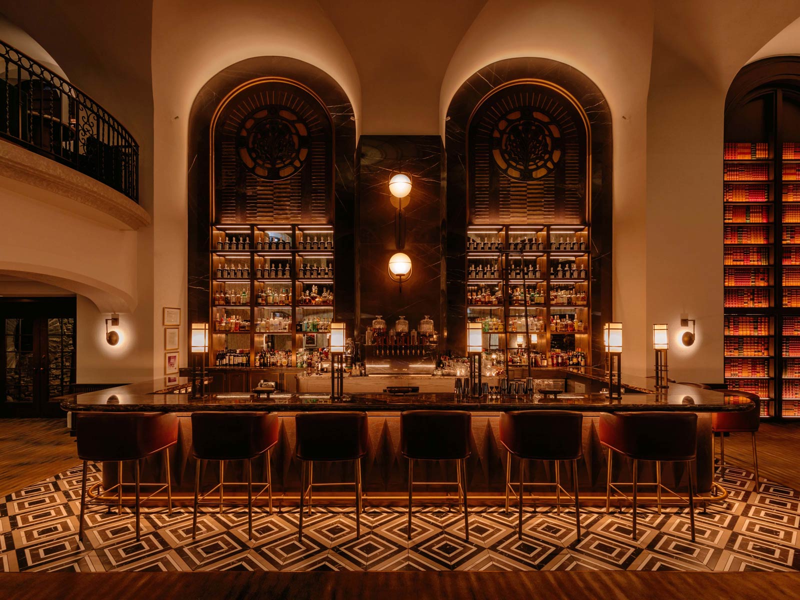 Tucked inside the Fairmont Banff Springs in Alberta, Rundle Bar is a grand and luxurious space that feels like you’re stepping back in time. Features include massive dueling arches, nested chandeliers, stained glass and copious furnishings upholstered in Tiger Leather.