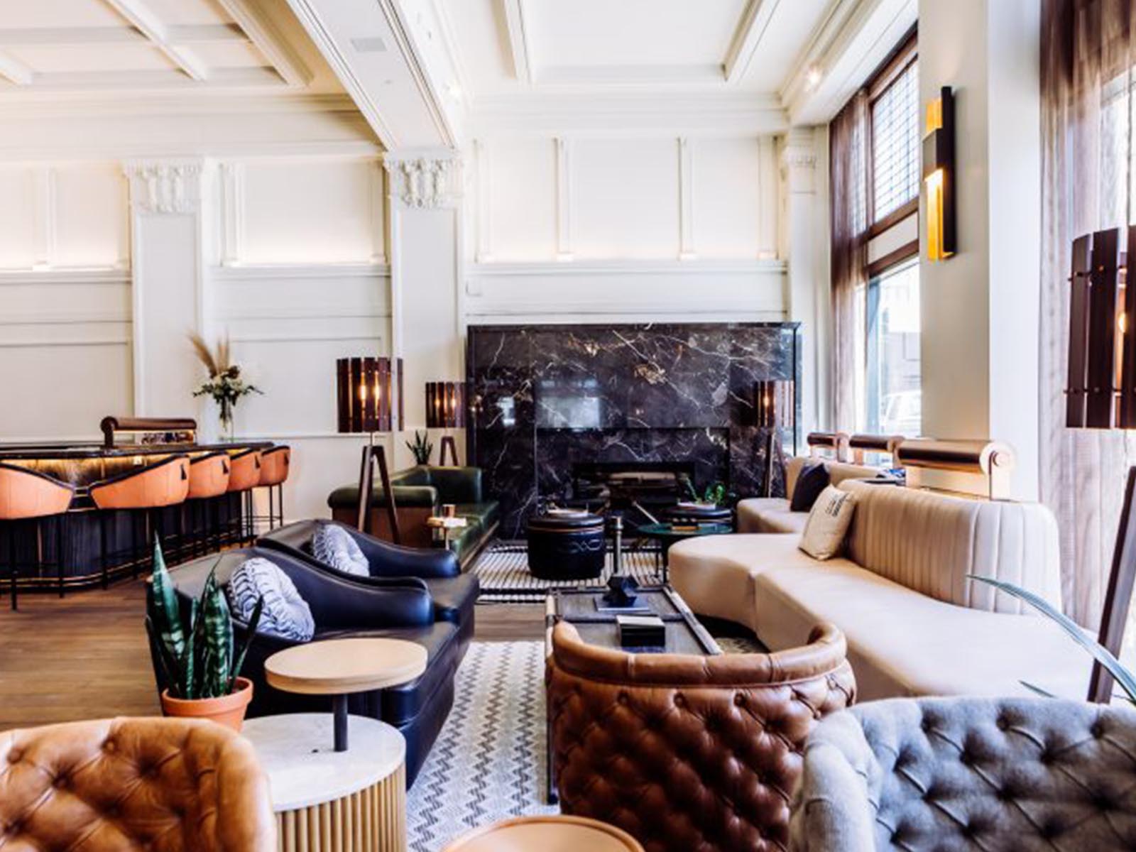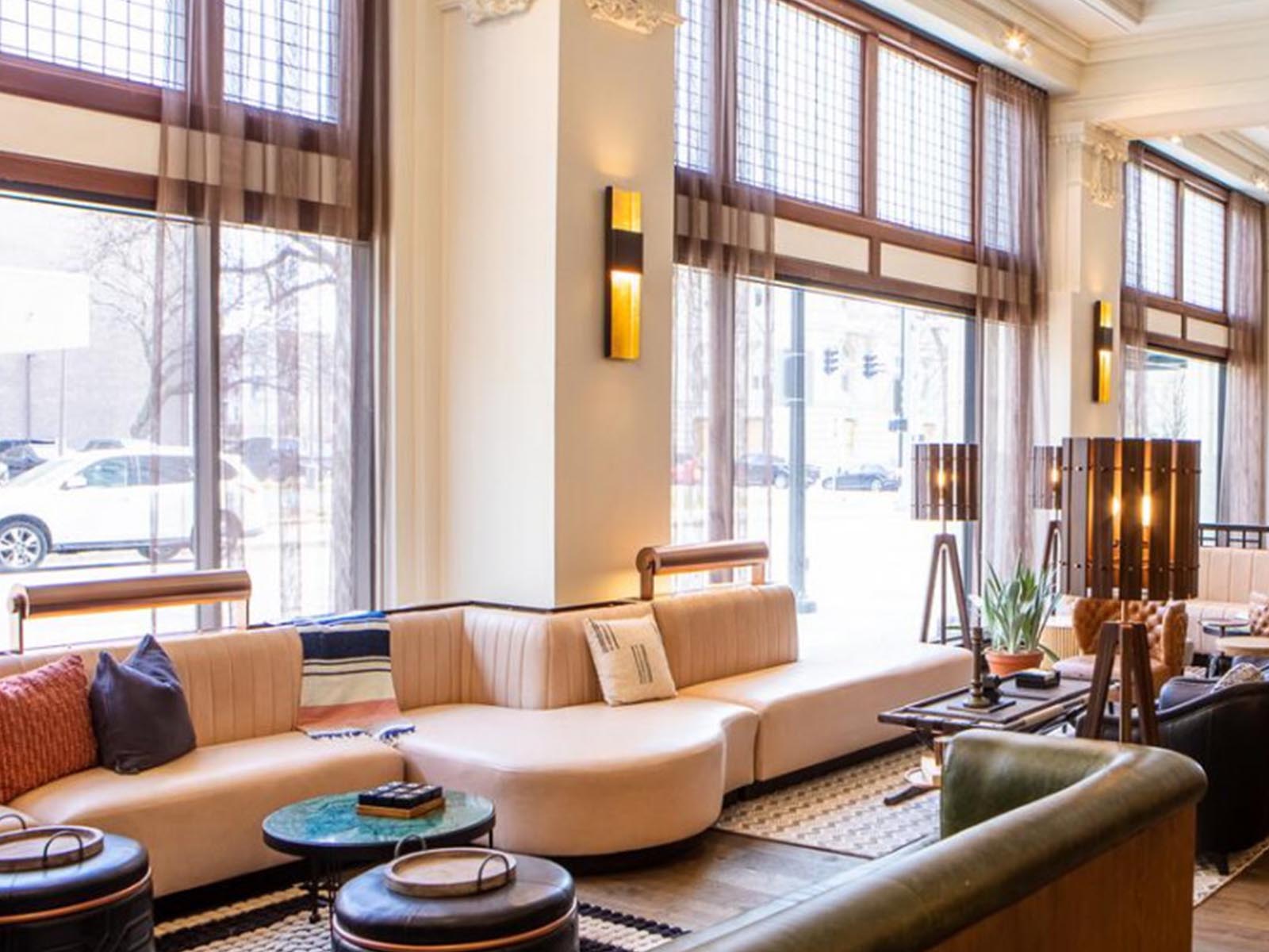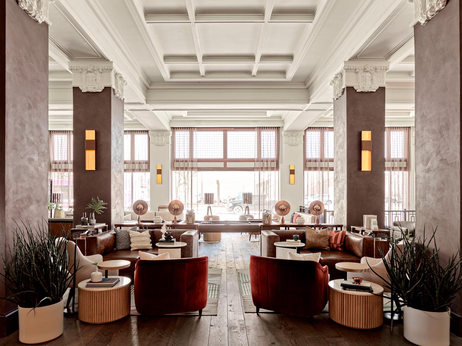 Midcentury modern meets contemporary artistry in Des Moines, Iowa’s Surety Hotel. The leather-clad lobby chairs and sofas feature a spectrum of Tiger Leather articles, including Sierra Jute Brown, Montana Timberline Green and Chamonix Glace, just to name a few.