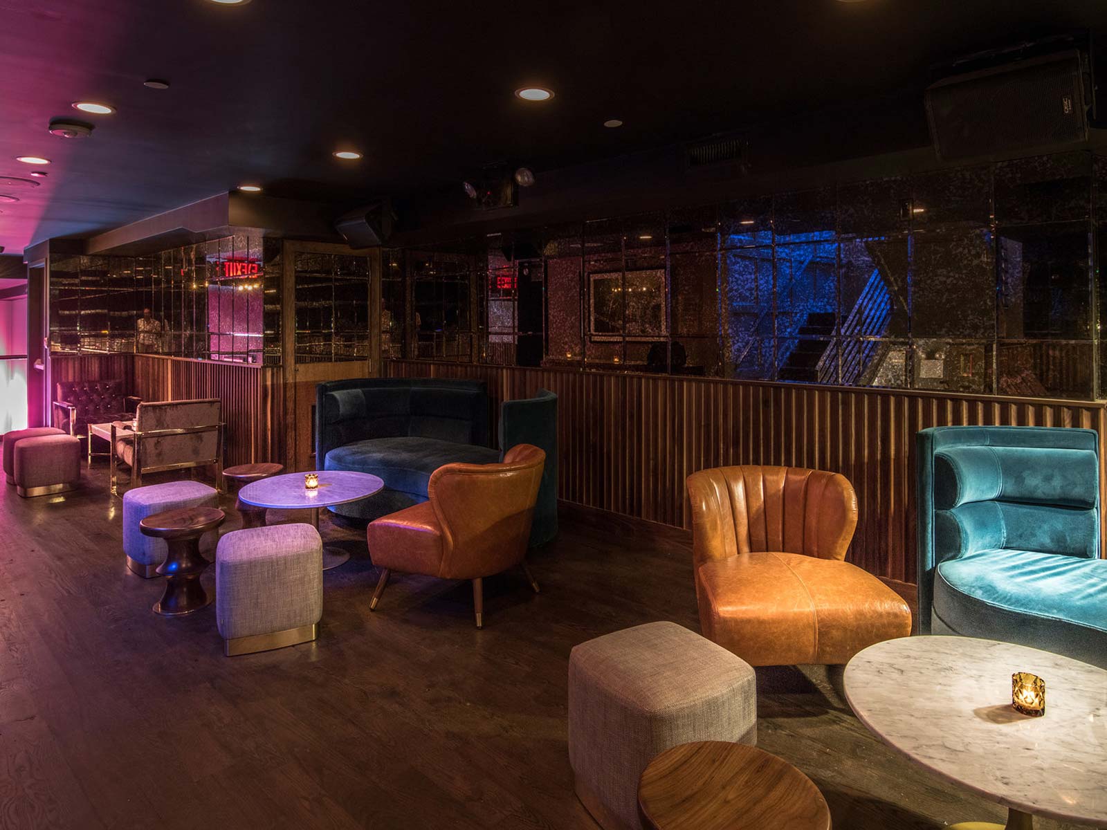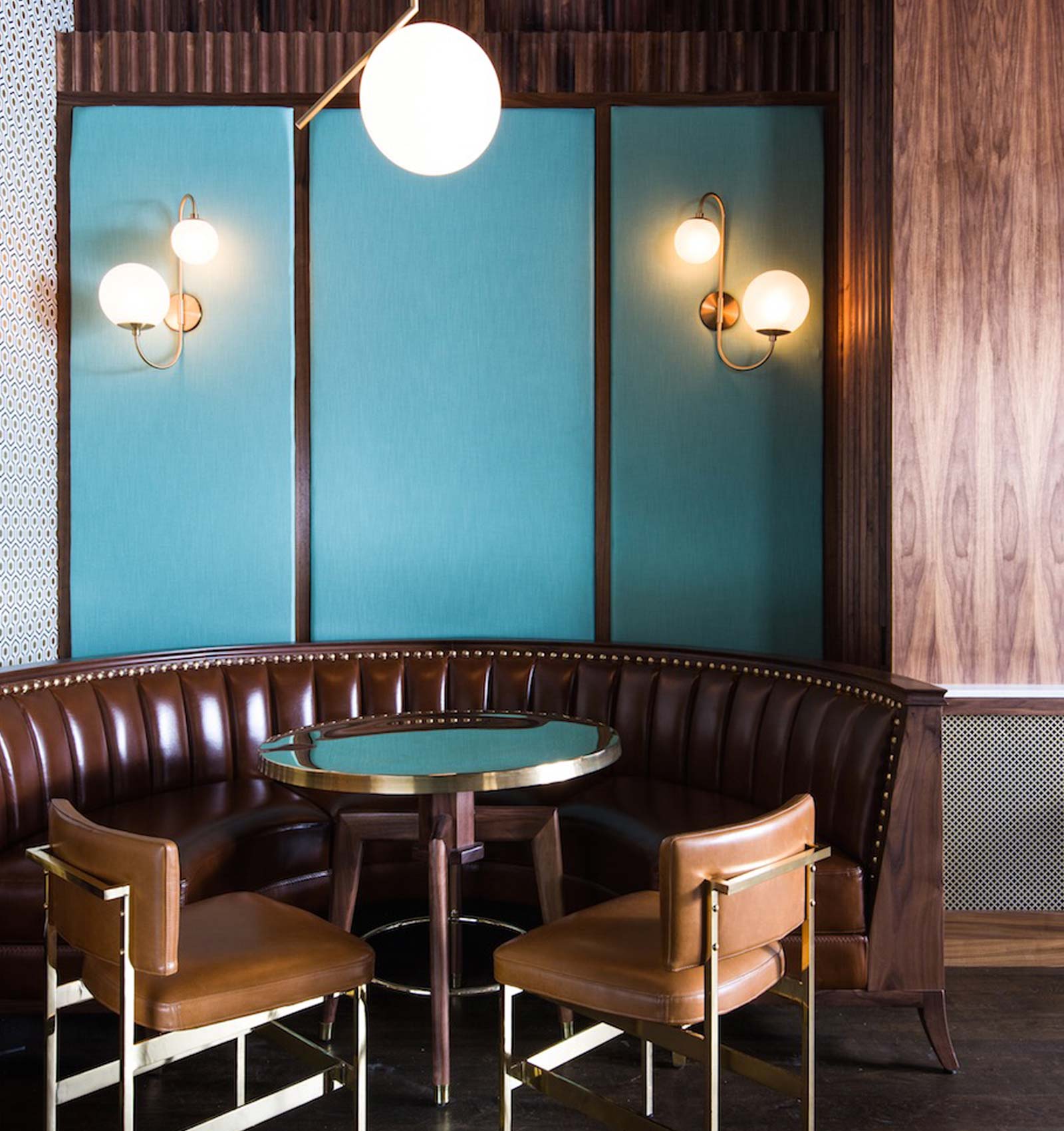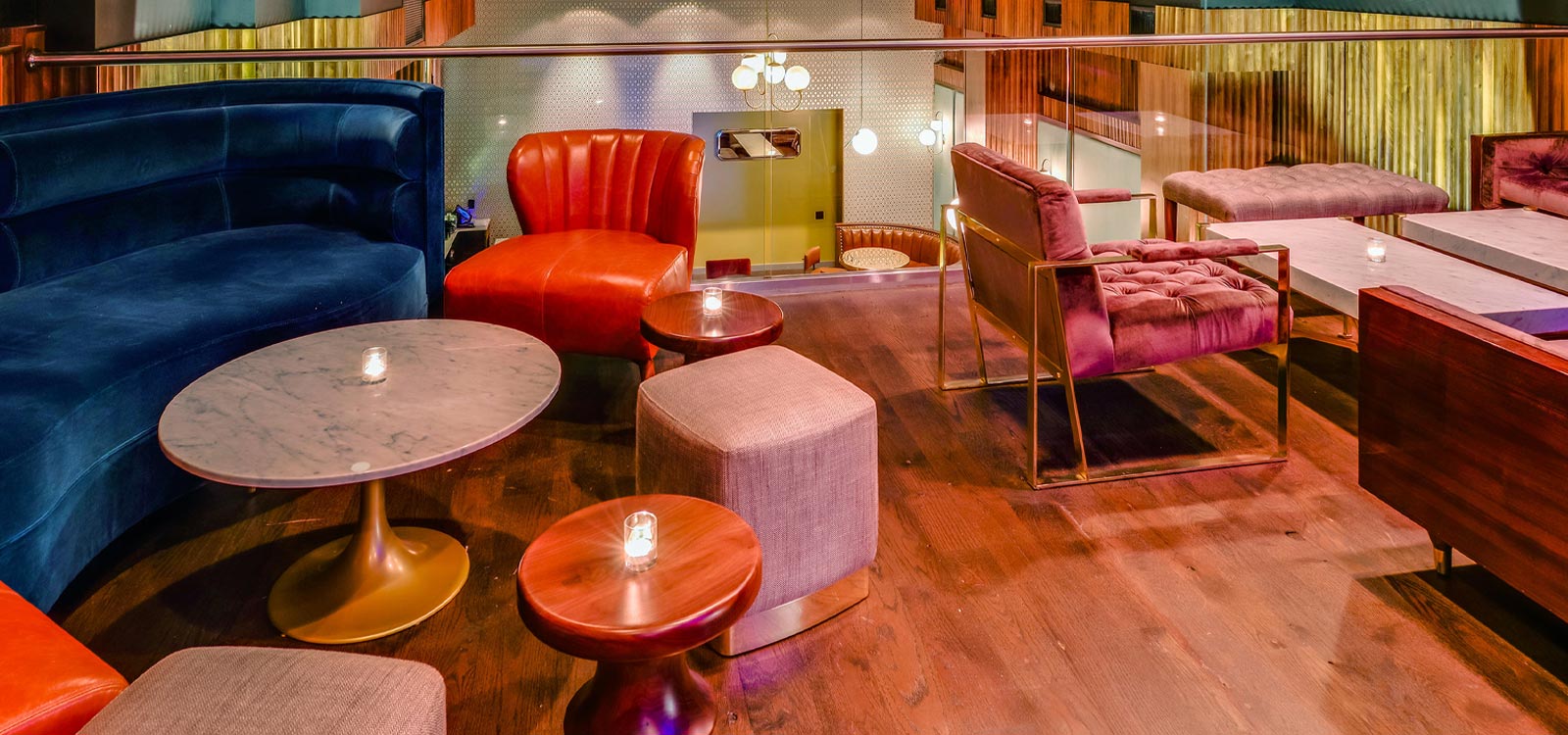 The 70s are on full display at The Vnyl, a multi-purpose space which feels residential while still having the functionality of a restaurant, event space and club. Colorful splashes abound, offset by leather-clad chairs, banquettes and barstools upholstered in fine Italian leather by Tiger.